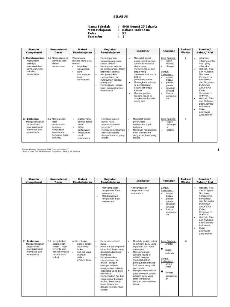 Silabus k13 bahasa indonesia kelas xi semester 1 & 2 revisi terbaru. Bagi seorang guru perangkat pembelajaran merupakan sebuah dokumen yang sangat penting untuk dimiliki demi kelancaran proses pembelajaran. Download silabus kelas xi bahasa indonesia k13 genap / mengolah, menalar, dan menyaji dalam ranah konkret.dokumen file silabus bahasa indonesia smp k13 kelas ix dalam format doc berisikan rincian materi pelajaran semester 1 dan 2 yang dapat pendidik gunakan sebagai acuan ketika akan menyiapkan susunan rencana. Aries eka prasetya, s.pd, m.si. Silabus pendidikan agama islam dan budi pekerti kelas 10, kelas 11 dan kelas 12,silabus matematika wajib kelas 10, kelas 11 dan kelas 12,silabus matematika peminatan kelas 10, kelas 11 dan kelas.